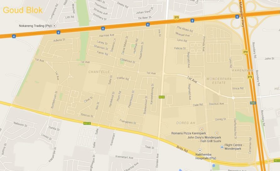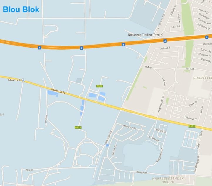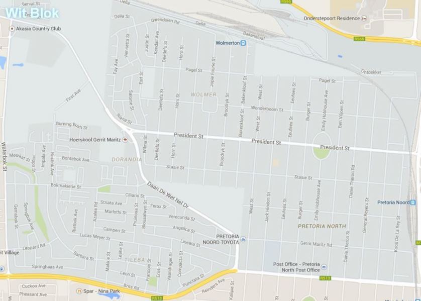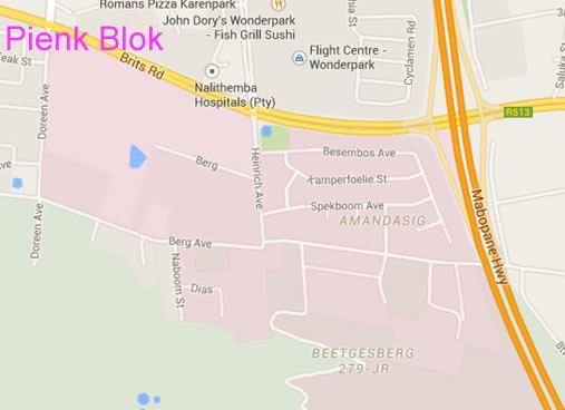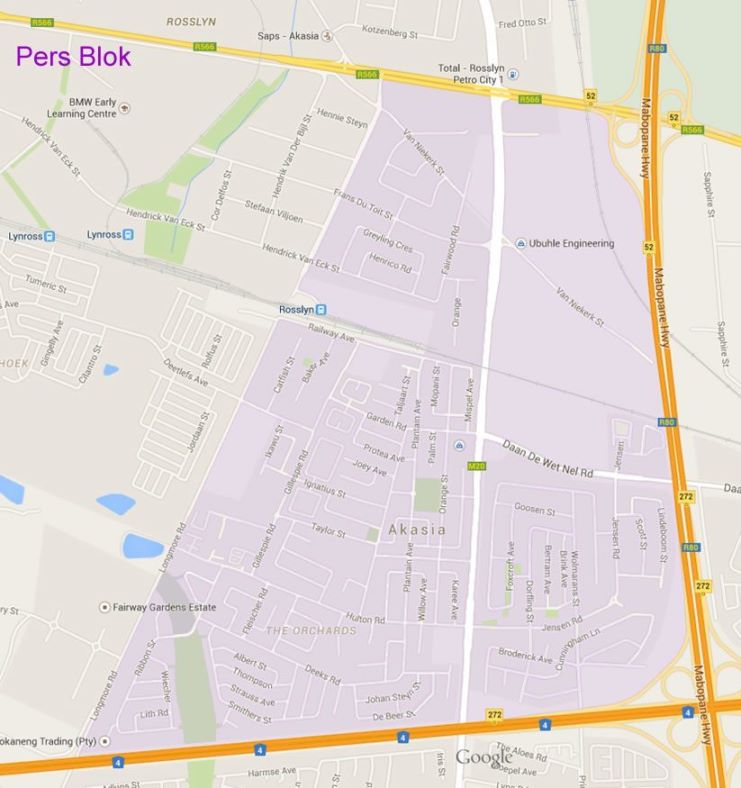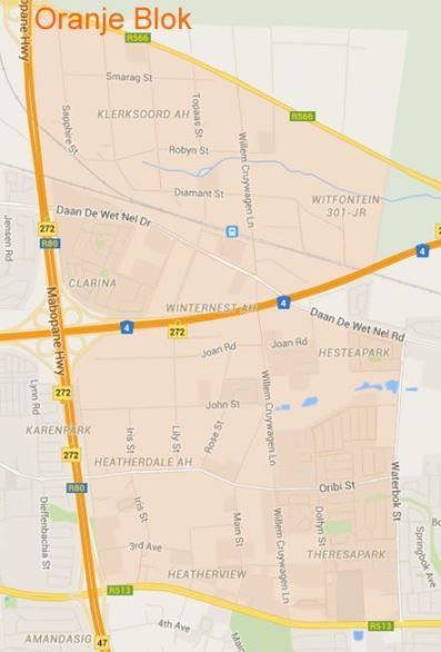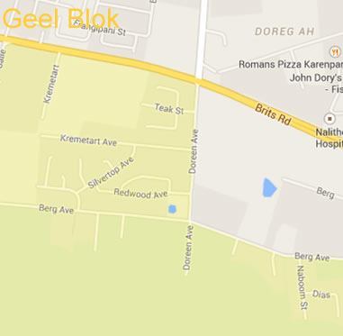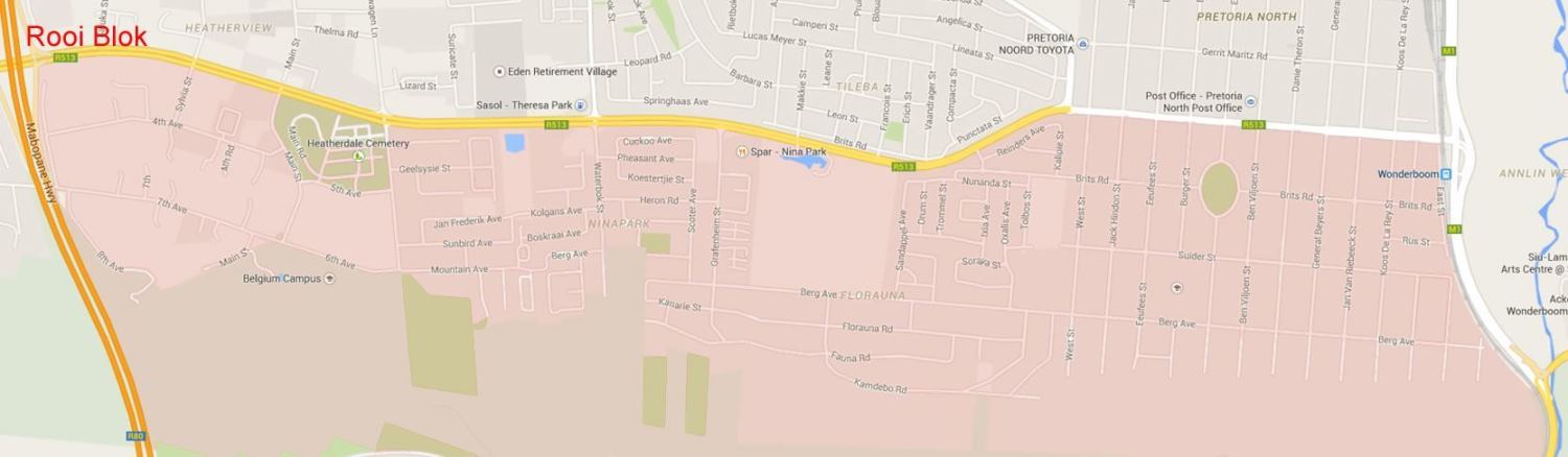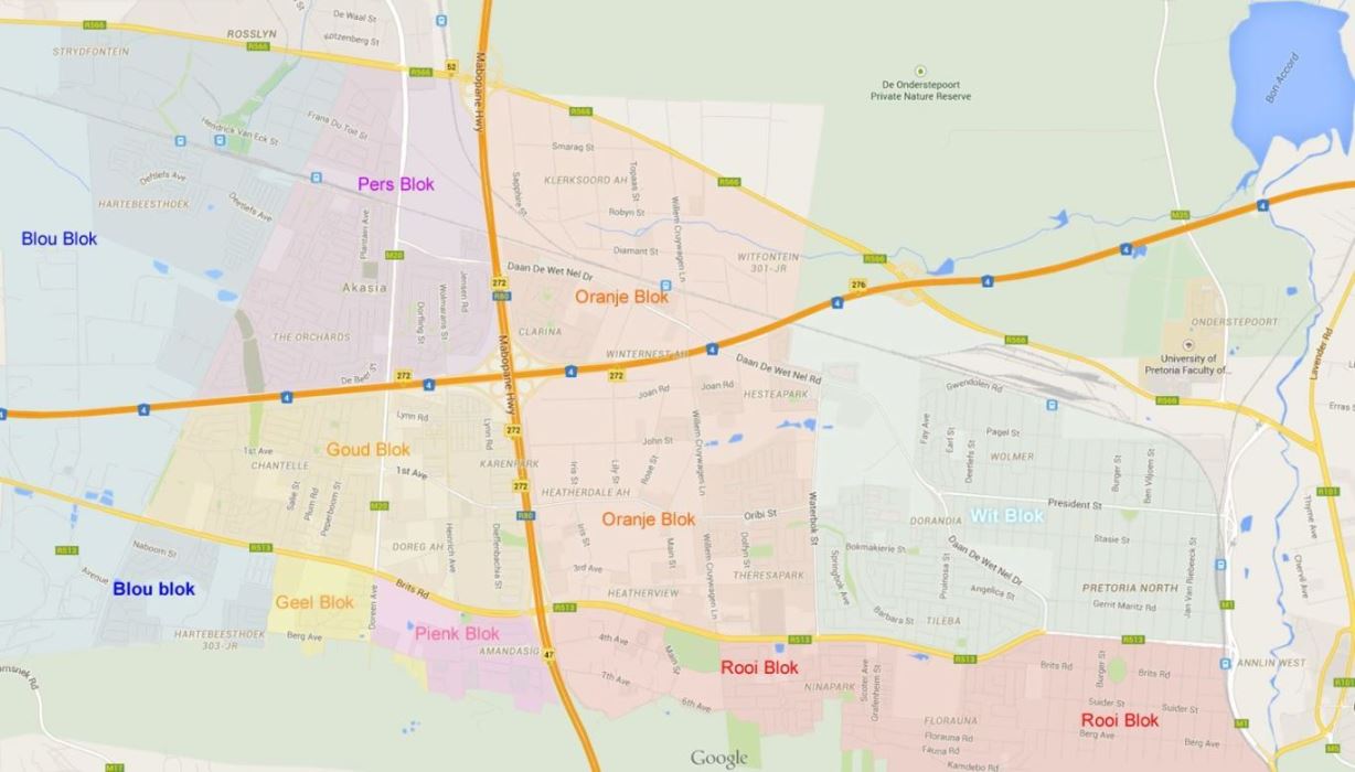 Al die areas wat nie deel vorm van die kleur blokke nie, val onder die groen blok.